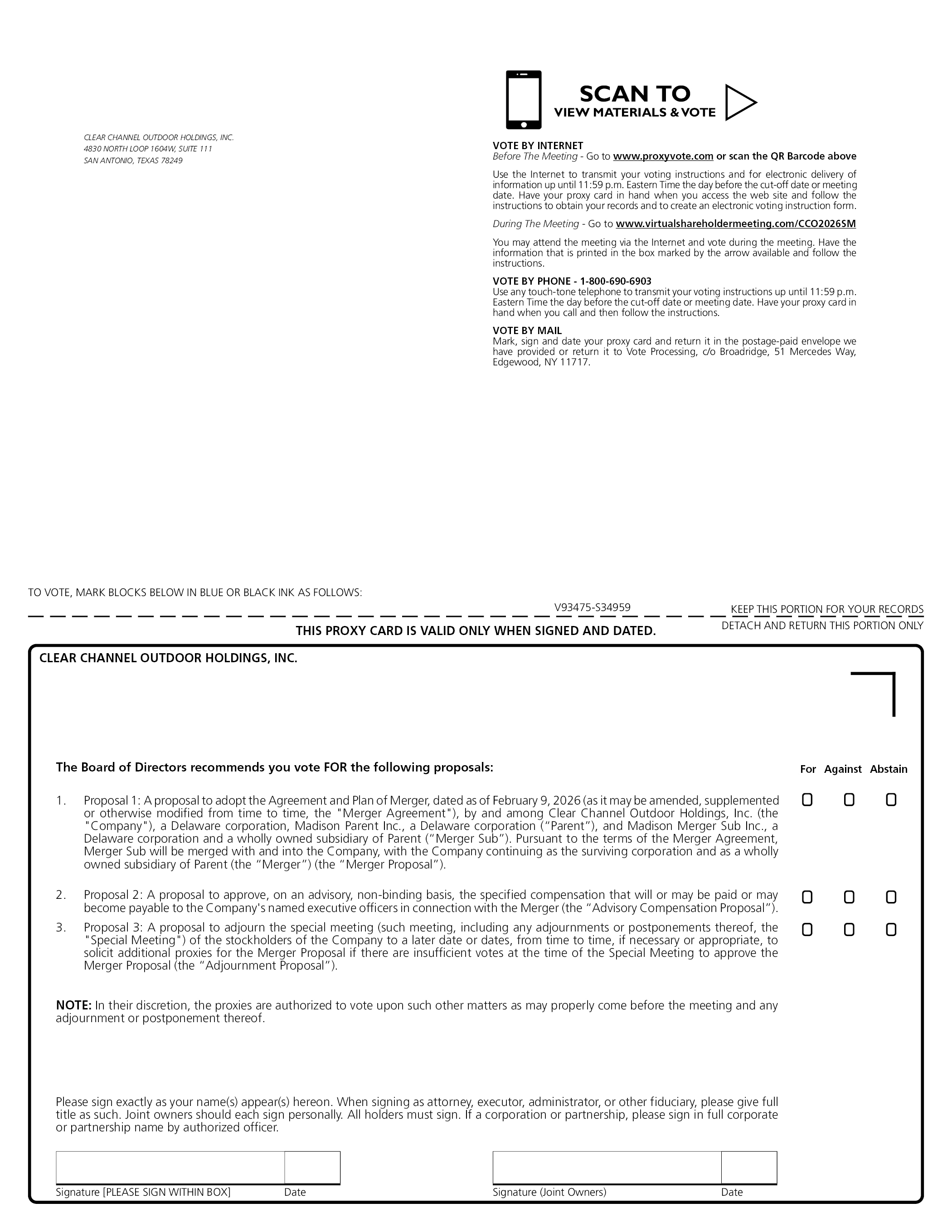 SCAN TO VIEW MATERIALS & VOTE VOTE BY INTERNET Before The Meeting - Go to www.proxyvote.com or scan the QR Barcode above Use the Internet to transmit your voting instructions and for electronic delivery of information up until 11:59 p.m. Eastern Time the day before the cut-off date or meeting date. Have your proxy card in hand when you access the web site and follow the instructions to obtain your records and to create an electronic voting instruction form. During The Meeting - Go to www.virtualshareholdermeeting.com/CCO2026SM You may attend the meeting via the Internet and vote during the meeting. Have the information that is printed in the box marked by the arrow available and follow the instructions. VOTE BY PHONE - 1-800-690-6903 Use any touch-tone telephone to transmit your voting instructions up until 11:59 p.m. Eastern Time the day before the cut-off date or meeting date. Have your proxy card in hand when you call and then follow the instructions. VOTE BY MAIL Mark, sign and date your proxy card and return it in the postage-paid envelope we have provided or return it to Vote Processing, c/o Broadridge, 51 Mercedes Way, Edgewood, NY 11717. CLEAR CHANNEL OUTDOOR HOLDINGS, INC. 4830 NORTH LOOP 1604W, SUITE 111 SAN ANTONIO, TEXAS 78249 V93475-S34959 CLEAR CHANNEL OUTDOOR HOLDINGS, INC. The Board of Directors recommends you vote FOR the following proposals: For Against Abstain 1. Proposal 1: A proposal to adopt the Agreement and Plan of Merger, dated as of February 9, 2026 (as it may be amended, supplemented or otherwise modified from time to time, the “Merger Agreement”), by and among Clear Channel Outdoor Holdings, Inc. (the “Company”), a Delaware corporation, Madison Parent Inc., a Delaware corporation (“Parent”), and Madison Merger Sub Inc., a Delaware corporation and a wholly owned subsidiary of Parent (“Merger Sub”). Pursuant to the terms of the Merger Agreement, Merger Sub will be merged with and into the Company, with the Company continuing as the surviving corporation and as a wholly owned subsidiary of Parent (the “Merger”) (the “Merger Proposal”). 2. Proposal 2: A proposal to approve, on an advisory, non-binding basis, the specified compensation that will or may be paid or may become payable to the Company’s named executive officers in connection with the Merger (the “Advisory Compensation Proposal”). 3. Proposal 3: A proposal to adjourn the special meeting (such meeting, including any adjournments or postponements thereof, the “Special Meeting”) of the stockholders of the Company to a later date or dates, from time to time, if necessary or appropriate, to solicit additional proxies for the Merger Proposal if there are insufficient votes at the time of the Special Meeting to approve the Merger Proposal (the “Adjournment Proposal”). NOTE: In their discretion, the proxies are authorized to vote upon such other matters as may properly come before the meeting and any adjournment or postponement thereof. Please sign exactly as your name(s) appear(s) hereon. When signing as attorney, executor, administrator, or other fiduciary, please give full title as such. Joint owners should each sign personally. All holders must sign. If a corporation or partnership, please sign in full corporate or partnership name by authorized officer.